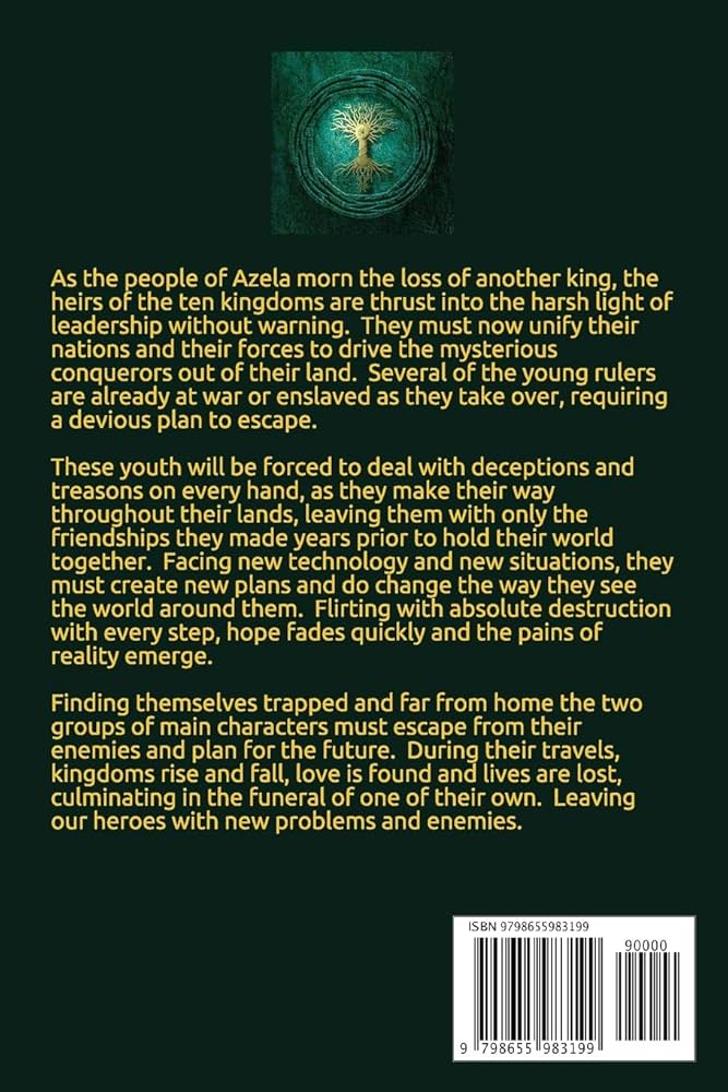 As the people of Azela mourn the loss of another king, the heirs of the ten kingdoms are thrust into the harsh light of leadership without warning. They must now unify their nations and their forces to drive the mysterious conquerors out of their land. Several of the young rulers are already at war or enslaved as they take over, requiring a devious plan to escape. These youth will be forced to deal with deceptions and treasons on every hand, as they make their way throughout their lands, leaving them with only the friendships they made years prior to hold their world together. Facing new technology and new situations, they must create new plans and change the way they see the world around them. Flirting with absolute destruction with every step, hope fades quickly and the pains of reality emerge. Finding themselves trapped and far from home the two groups of main characters must escape from their enemies and plan for the future. During their travels, kingdoms rise and fall, love is found and lives are lost, culminating in the funeral of one of their own. Leaving our heroes with new problems and enemies.